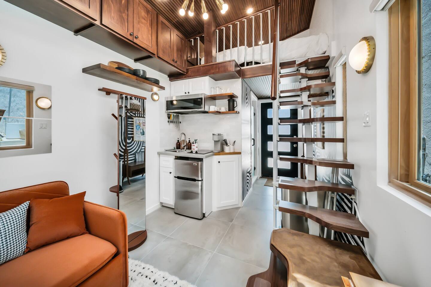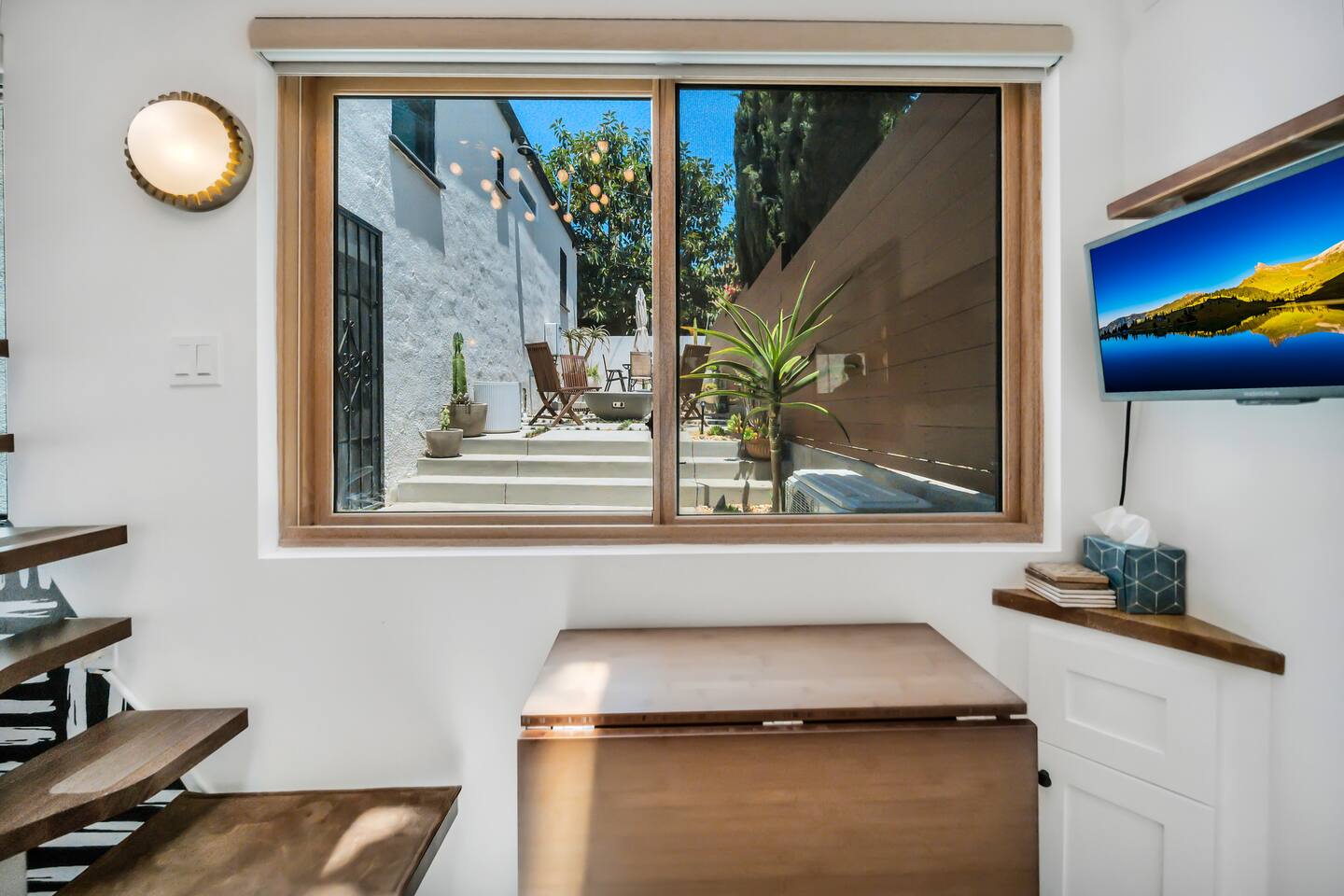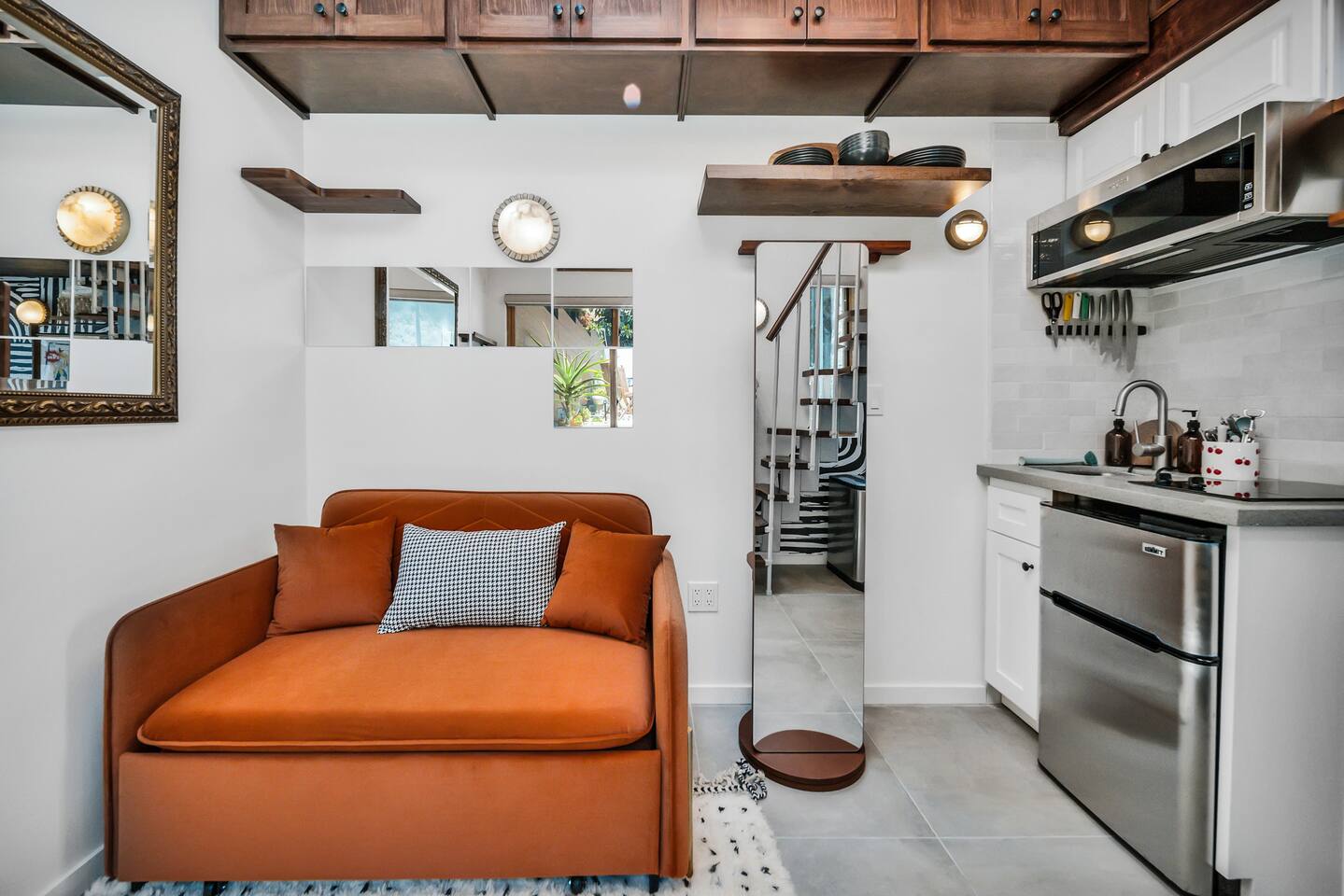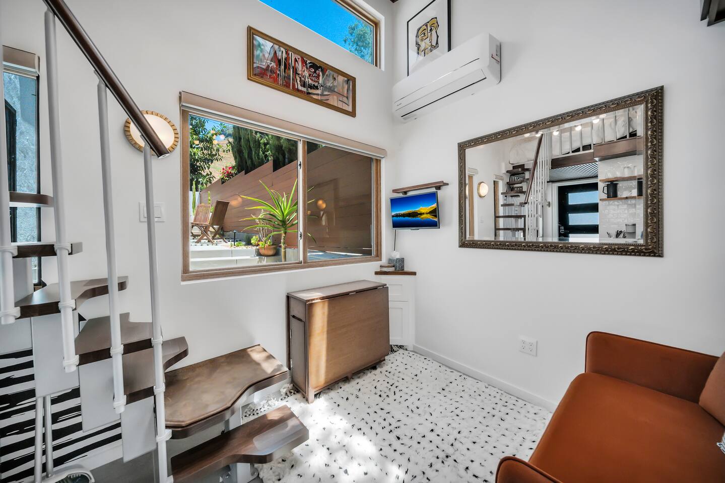 ✨ The Space Step inside this light-filled designer hideaway, featuring: – Soaring ceilings with custom woodwork and dramatic lighting – A plush lofted queen bed with privacy railing, accessible via a modern spiral staircase – Stylish burnt orange sleeper sofa on a plush shag rug for added guests – Sleek gourmet kitchen with induction cooktop, microwave, full sink, knife rack, and curated cookware – Spa-inspired bathroom with high-end tile and rainfall shower (not pictured) – Hidden storage throughout and beautifully crafted cabinetry 🪟 Floor-to-ceiling windows invite natural light while offering picturesque views of surrounding trees and hills. Enjoy your morning coffee on the outdoor patio area, surrounded by native California landscaping and birdsong. 🌴 Highlights – Ultra-modern spiral staircase – Designer lighting fixtures and mirrored accents – Custom cabinetry and thoughtful, space-savvy design – Air conditioning & heating – Smart TV and high-speed WiFi – Walkable to charming cafés, vintage shops, and trails 📍 Location Located in the artistic enclave of Eagle Rock, you're perfectly placed for exploring the Eastside. Nestled in a quiet residential area, this gem is the ideal mix of peaceful retreat and easy access to LA culture.